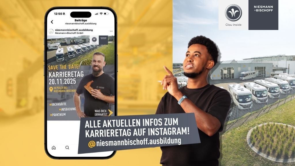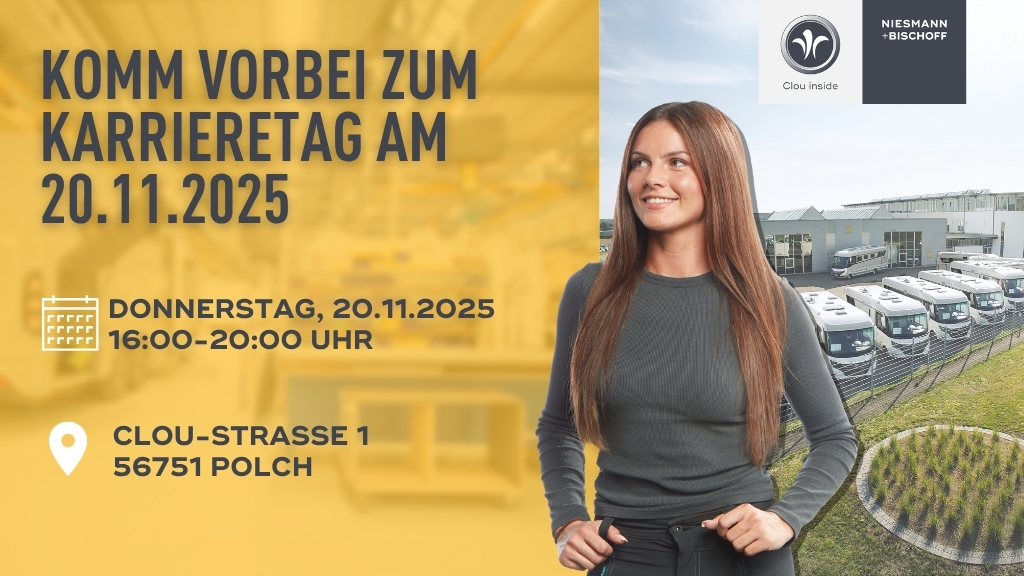 Du magst schon vorher in die Welt von Niesmann+Bischoff schauen? Am 08. + 09.11.2025 haben wir unseren jährlichen Tag der offenen Tür. Hier findest Du alles Infos: Tag der offenen Tür 2025