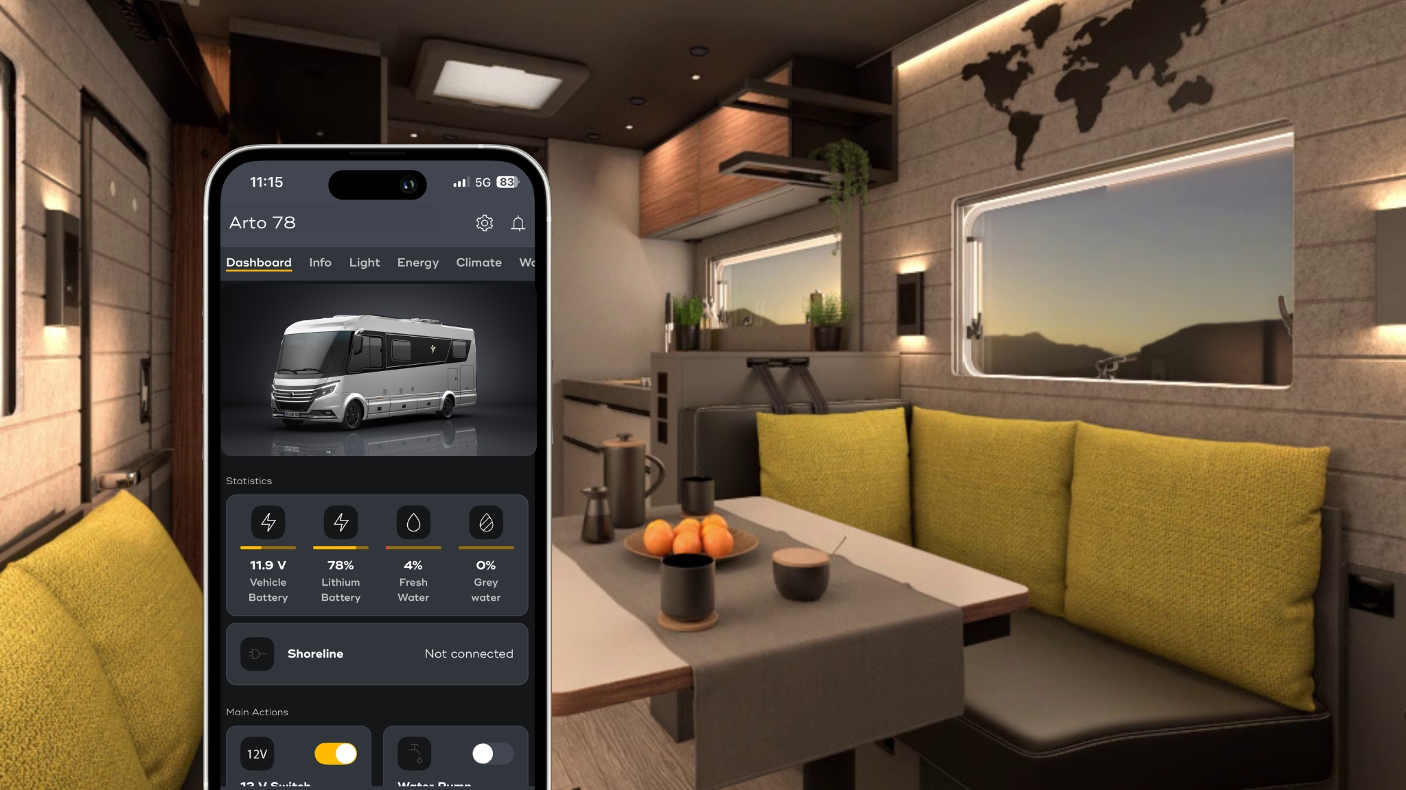 Tenk deg: Du står på toppen av fjellet på en kald skitur, klar for siste nedkjøring. Med et enkelt trykk aktiverer du det passende scenarioet. Bobilen varmer opp interiøret til ønsket komforttemperatur, vannet varmes for dusjen, og lysene slås på. Ved ankomst kan du slappe av med en gang.