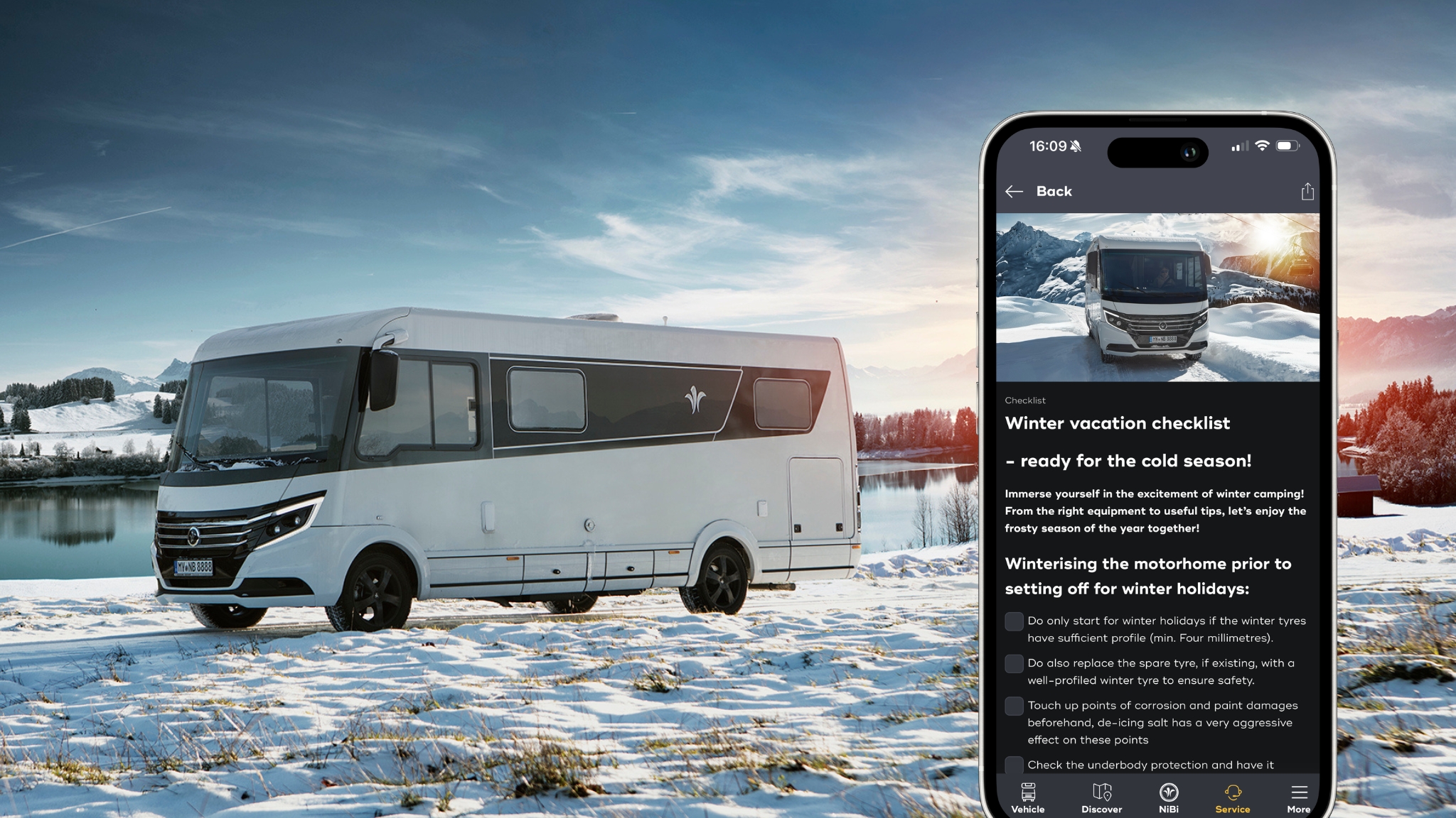 Før avreise kan du sjekke tank- og vannnivå direkte fra sofaen, få tips om vinterklargjøring av din Niesmann+Bischoff og se nyheter fra Polch. Bruk det interaktive kartet for å finne kjøretøyets plassering eller nærmeste servicepunkt og forhandler – med kun ett klikk.