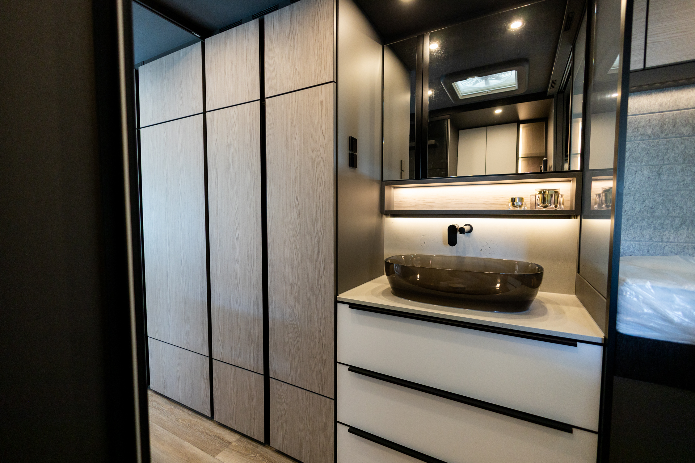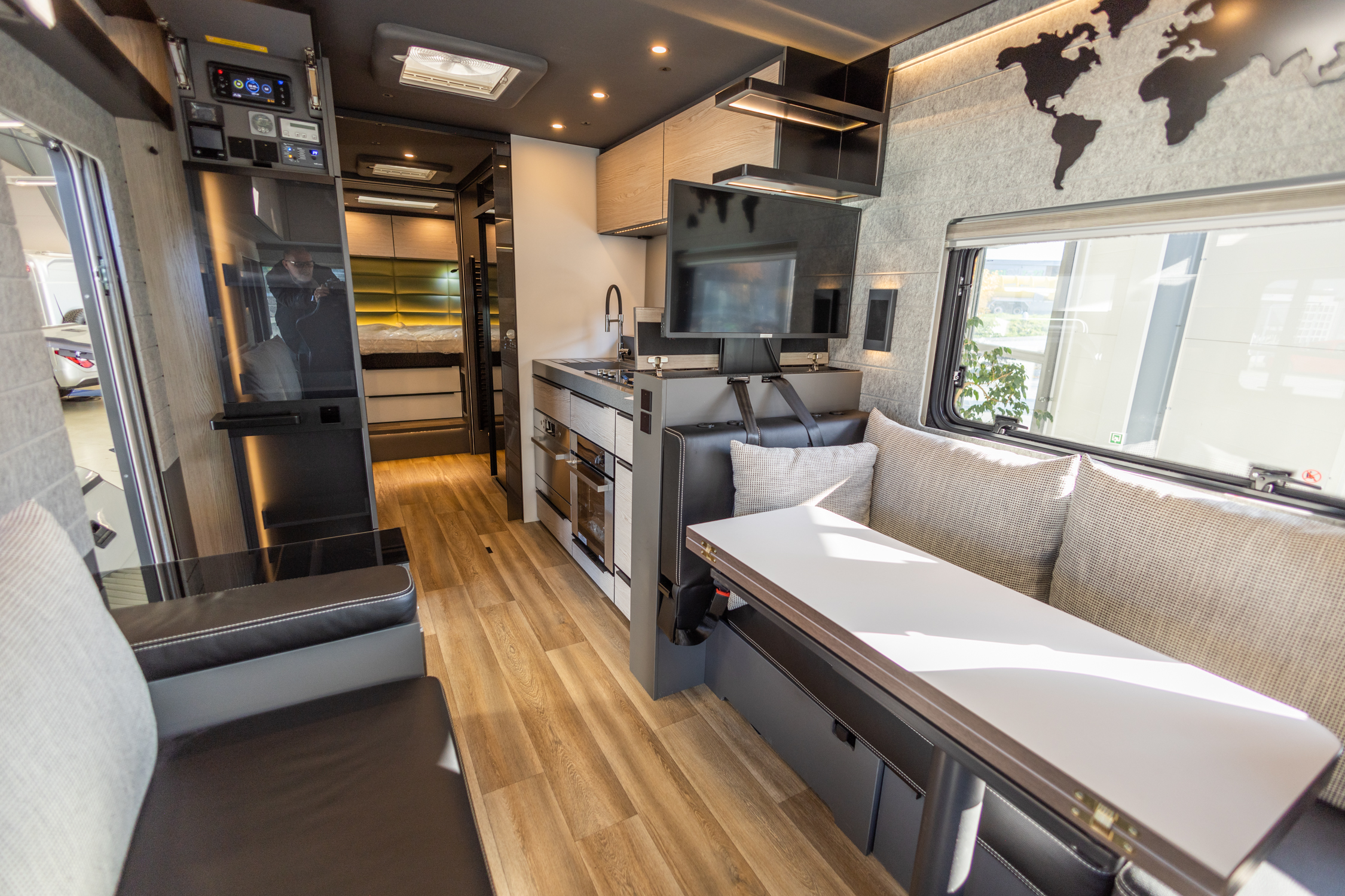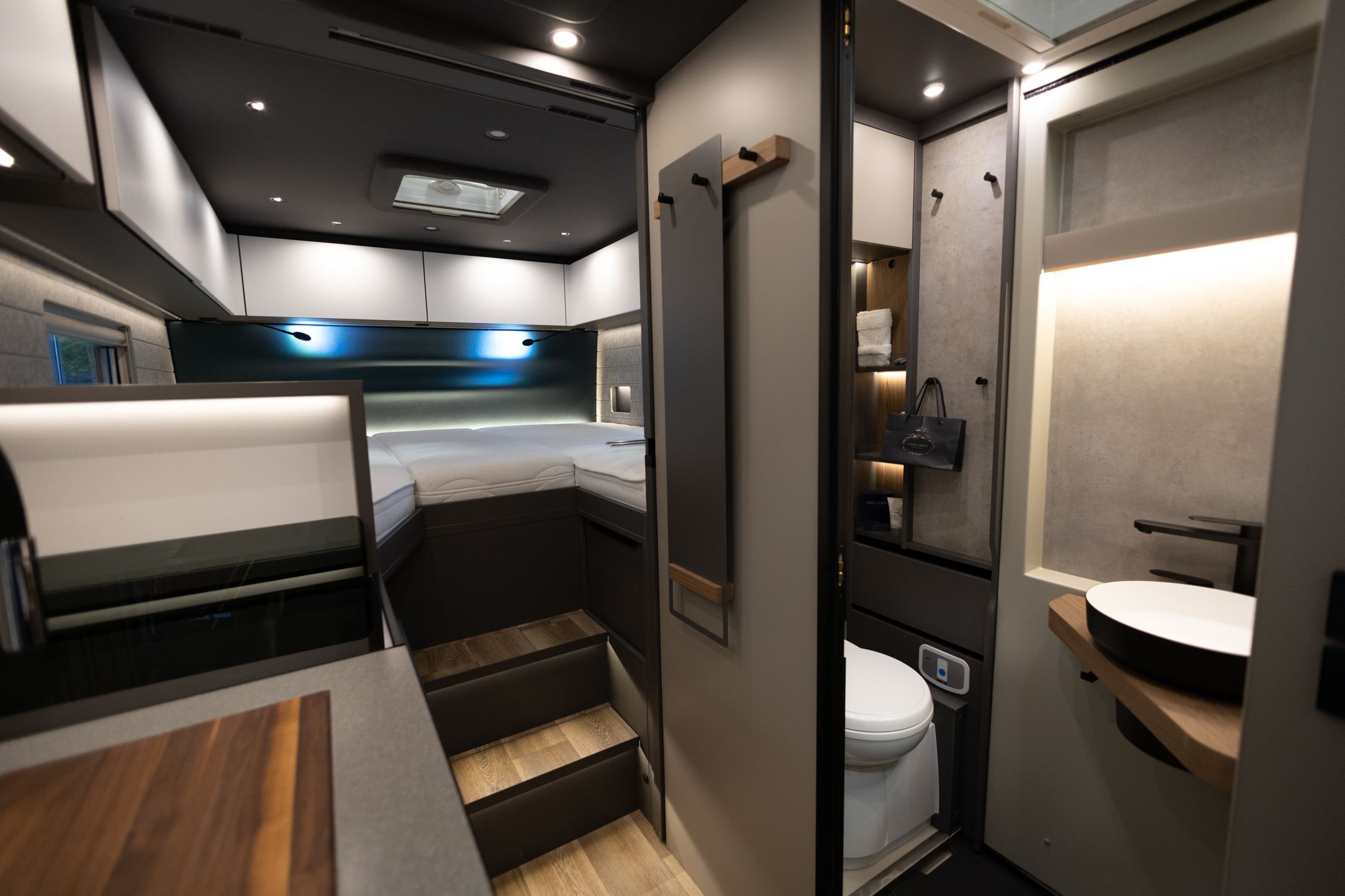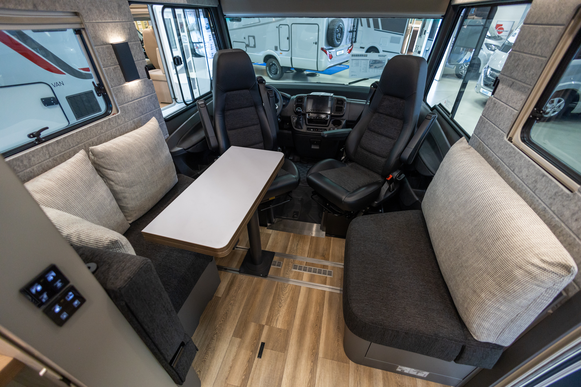 Innvendig sørger moderne veggkledning i naturlig akustisk filt for optimal lydkomfort, og et intuitivt belysningskonsept gjør bobilen til et ekte loft på hjul.